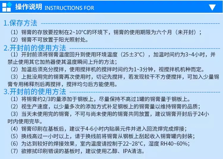 产品熔点:138℃ 颗粒度:20-45μm 存储说明:低温无卤锡膏在2-10℃环境下储存期限为6个月,使用前需常温下回温2-4小时以上方可开启,以防止受潮产生锡珠,然后搅拌均匀即可使用。 适用范围:散热器、高频头、遥控板、插件工艺等和不能承受高温的产品。